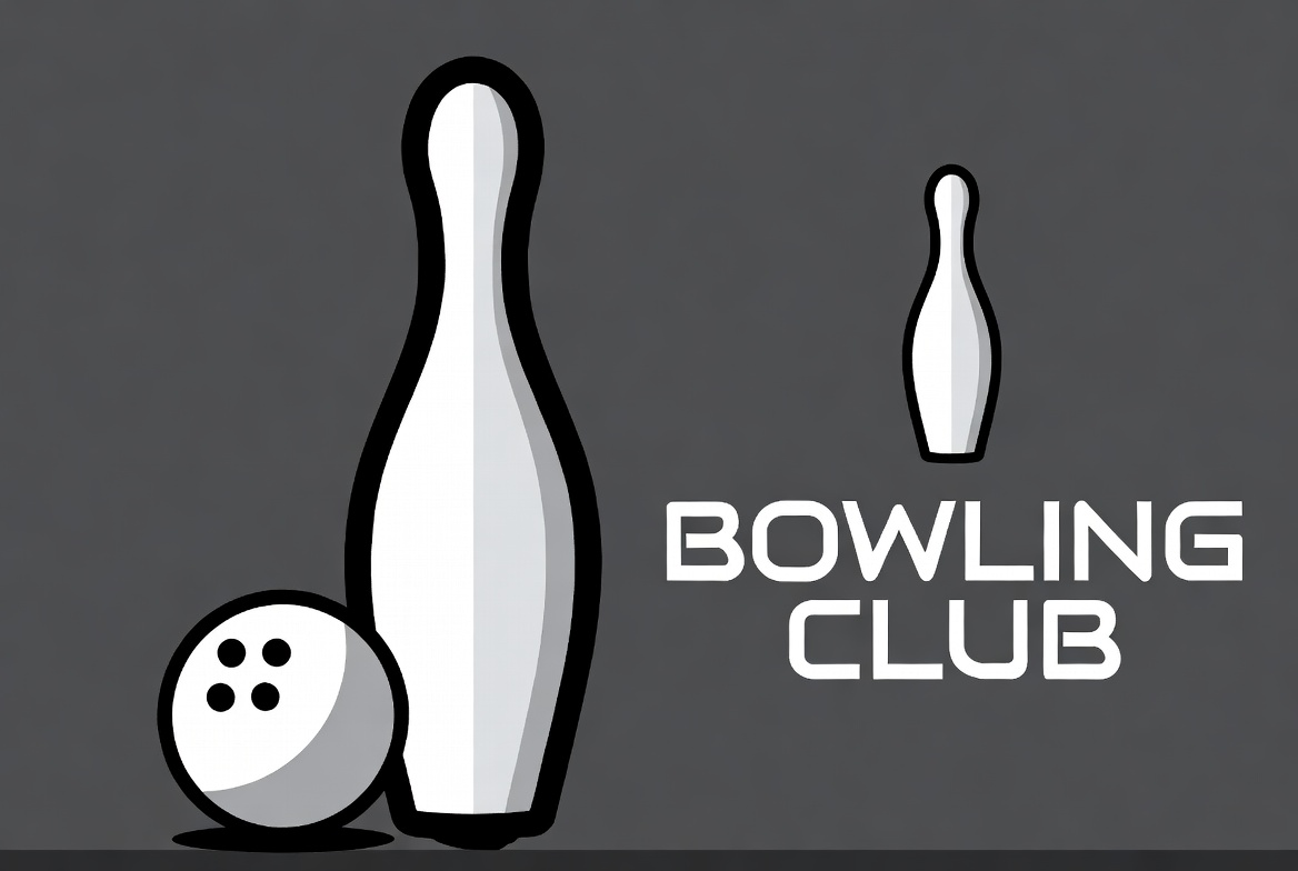 A large white bowling pin stands next to a smaller one on a dark gray background. A white bowling ball with black spots rests in front. Bold white text reads 'BOWLING CLUB' above the icons.