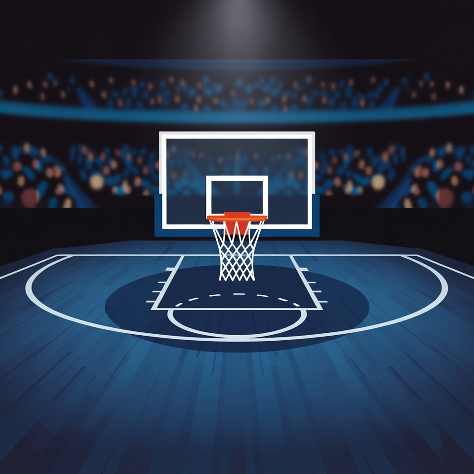 A white basketball hoop with orange net stands prominently on a blue court in a darkened arena. Spotlights illuminate the hoop against a blurred crowd in the stands. The wooden floor features court markings around the hoop.