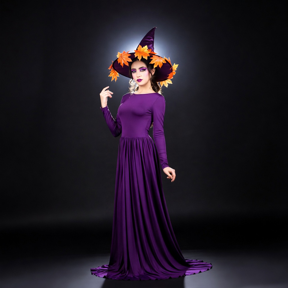 A woman with dramatic makeup and long dark hair wears a large black witch hat adorned with orange leaves. She poses elegantly in a flowing purple long-sleeved gown against a dark background. Her hand is raised near her face in a mystical gesture.