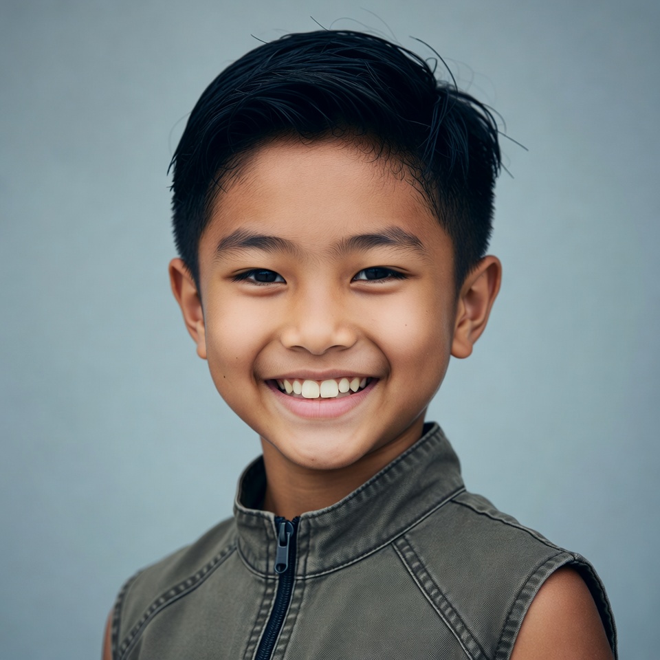 Asian, Asian boy, gray background, happy face, male, olive vest, portrait, short black hair, sleeveless vest, smiling boy, smiling face, young boy, zipper vest, boy