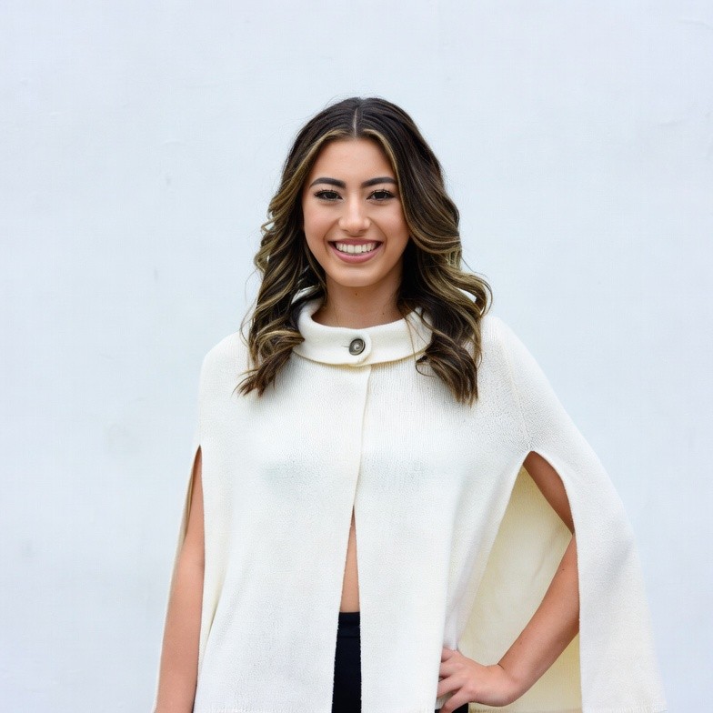 A young woman with long wavy brown hair and highlights smiles at the camera against a white background. She wears a white knit cape-style sweater with a high neck and button detail, featuring open arm slits. She stands confidently with one hand on her hip.