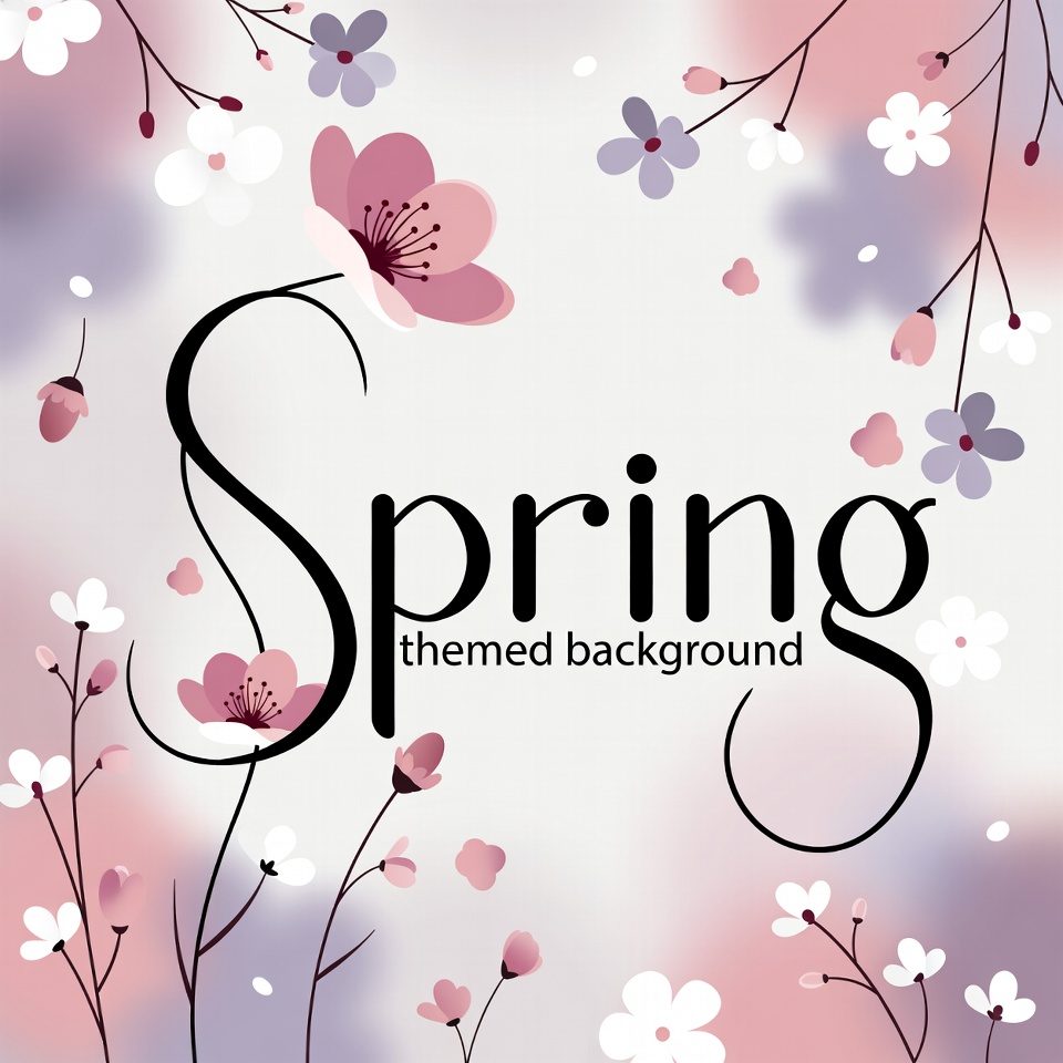 blossoms, branches, cherry blossoms, clipart, digital art, elegant text, floral background, floral design, flowers, gradient background, illustration, isolated background, nature graphic, pink flowers, purple flowers, seasonal background, spring theme, text, watercolor style, white flowers, spring