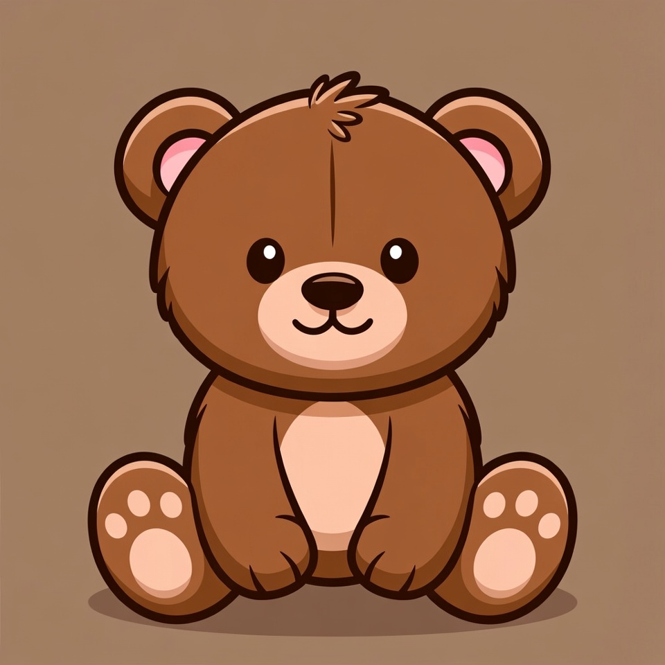 A kawaii-style cartoon teddy bear sits with a happy expression on a plain background. The brown bear has big shiny eyes, a small smiling mouth, and fluffy fur texture. Its paws rest on its lap, with pink inner ears and paw pads.
