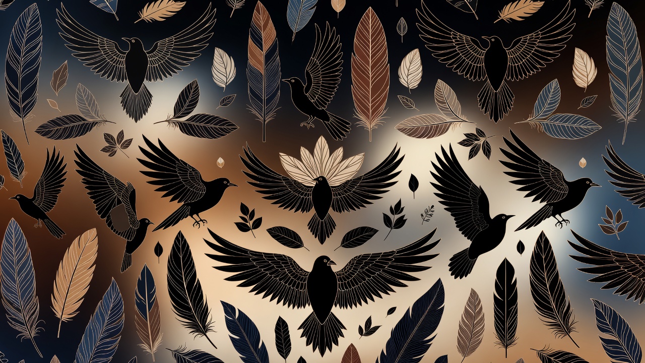 bird pattern, birds, black birds, blue feathers, brown feathers, clipart, crows, digital art, feather pattern, feathers, flying birds, illustration, isolated background, perched birds, raven flock, silhouettes, vector art, white feathers, wildlife art, winged birds, ravens