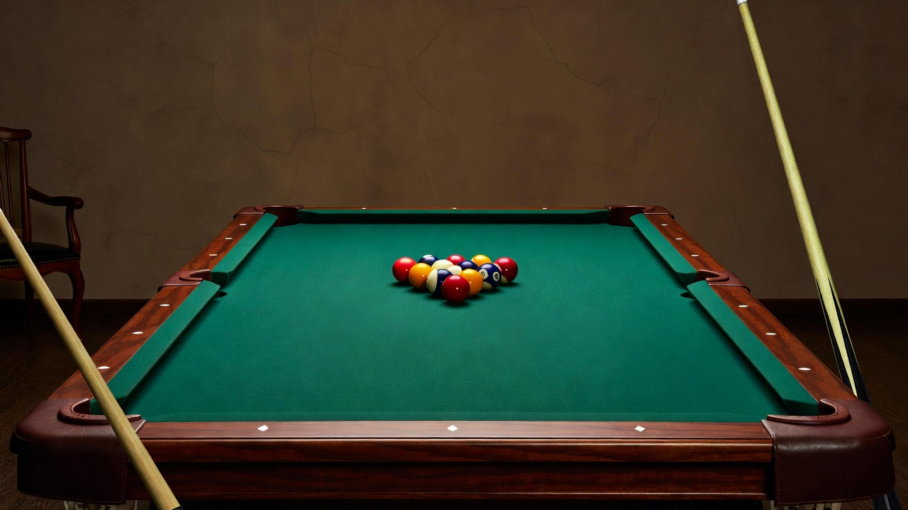 billiard balls, billiards, colored balls, cues, game setup, gaming, green felt, isolated background, no people, pool cues, racked balls, snooker, triangle rack, wooden table, pool table