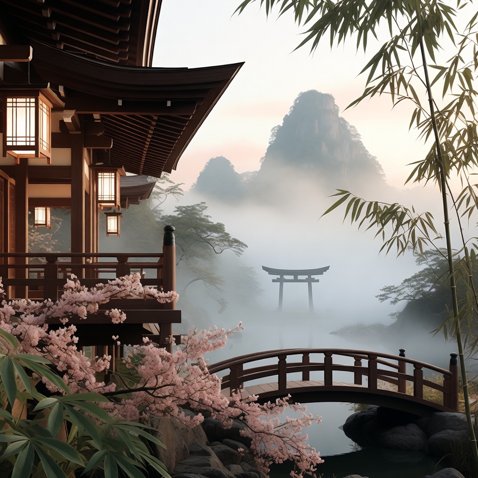 3D render, Asia, architecture, bamboo forest, cherry blossoms, digital art, fog, illustration, lake, lanterns, misty mountains, pagoda, pink flowers, rocks, serene landscape, torii gate, traditional building, wooden bridge, Japanese temple