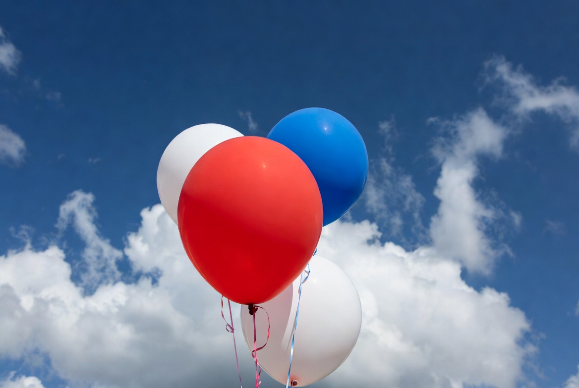 Fourth of July, Independence Day, blue balloon, bright sky, celebration, clouds, floating balloons, helium balloons, outdoor, party balloons, patriotic balloons, red balloon, sky background, tricolor balloons, white balloon, balloons