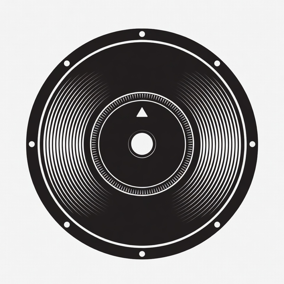 A black line art illustration of a round speaker on a white background. The speaker features concentric circles, bolts around the edge, and a central cone with a small triangle. It has a detailed engraved style with fine lines.