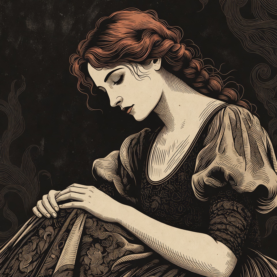 An illustration of a woman with long red braided hair gazes downward while sewing a lace-trimmed dress. She wears a vintage black gown with puffed sleeves and intricate patterns. The artwork features a dark starry background with swirling smoke effects.