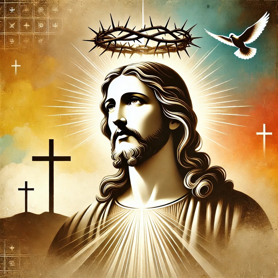 An artistic illustration of Jesus Christ with long hair and beard, wearing a crown of thorns and a white robe. A glowing halo surrounds his head, with radiant light beams and a white dove flying nearby. Crosses and crosses appear on the textured, colorful background with grid patterns.