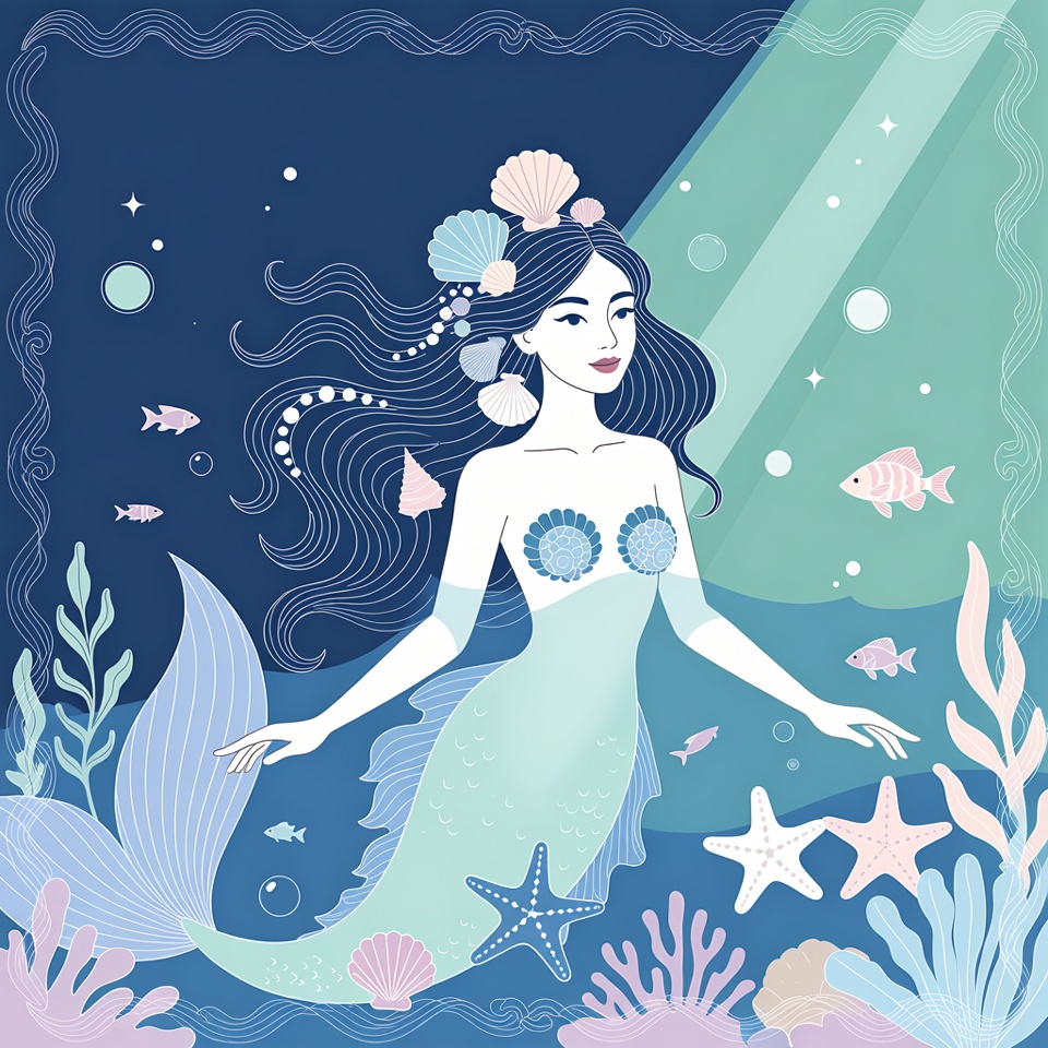 An Asian woman as a mermaid swims in a dark blue underwater world with green light beams. She has long wavy black hair adorned with seashells, wears shell bikini top, and extends her arms amid colorful fish, starfish, seaweed, and bubbles. The illustration features a decorative border and vibrant pastel tones.