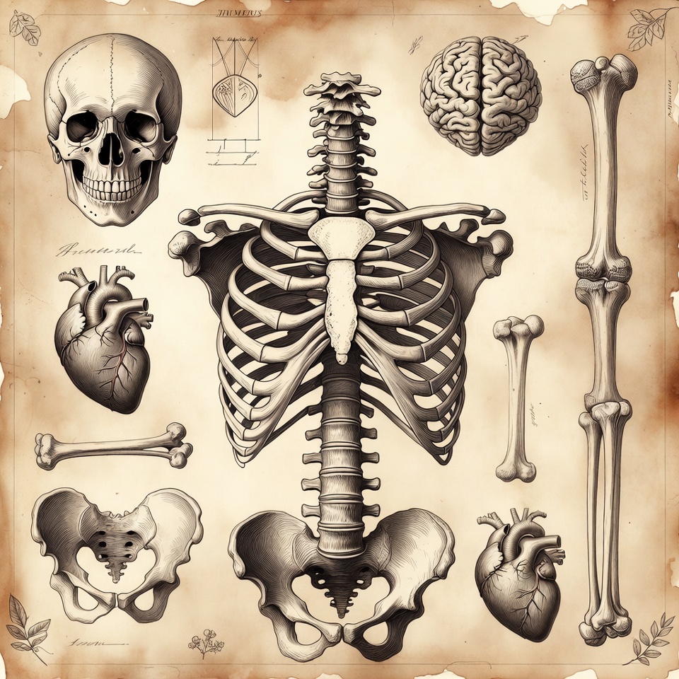 aged paper, anatomy illustration, antique, bones, brain, clipart, diagram, educational, femur, heart, humerus, isolated background, medical illustration, pelvis, ribcage, sepia, skull, spine, vintage, human skeleton