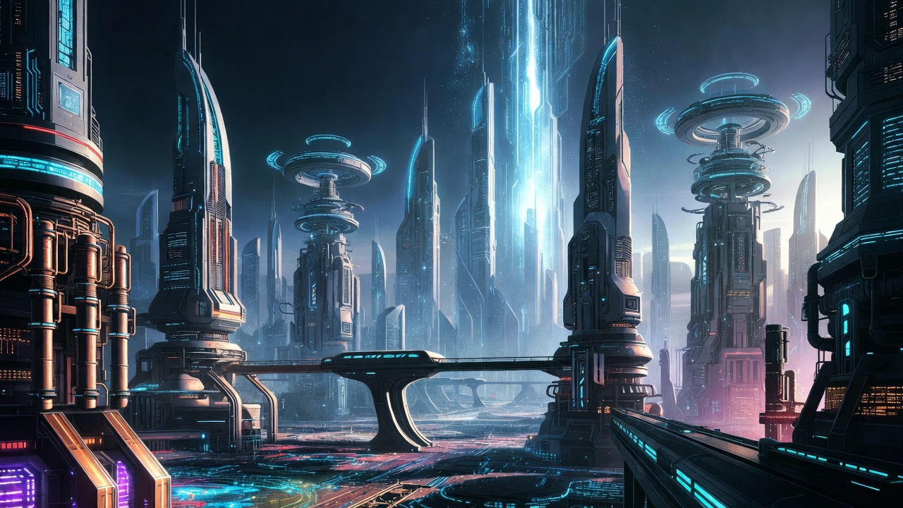 A vibrant cyberpunk cityscape features towering skyscrapers with neon lights and glowing accents. Futuristic bridges connect the massive structures, and flying elements hover above a neon-lit ground. The scene is rendered in a detailed digital illustration style with blues, purples, and oranges dominating the palette.