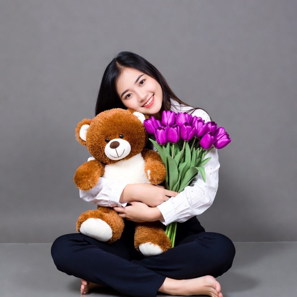 A young Asian woman with long black hair smiles happily while sitting on the floor. She hugs a large brown teddy bear and holds a vibrant bouquet of purple tulips. She wears a white blouse and black pants against a plain gray background.