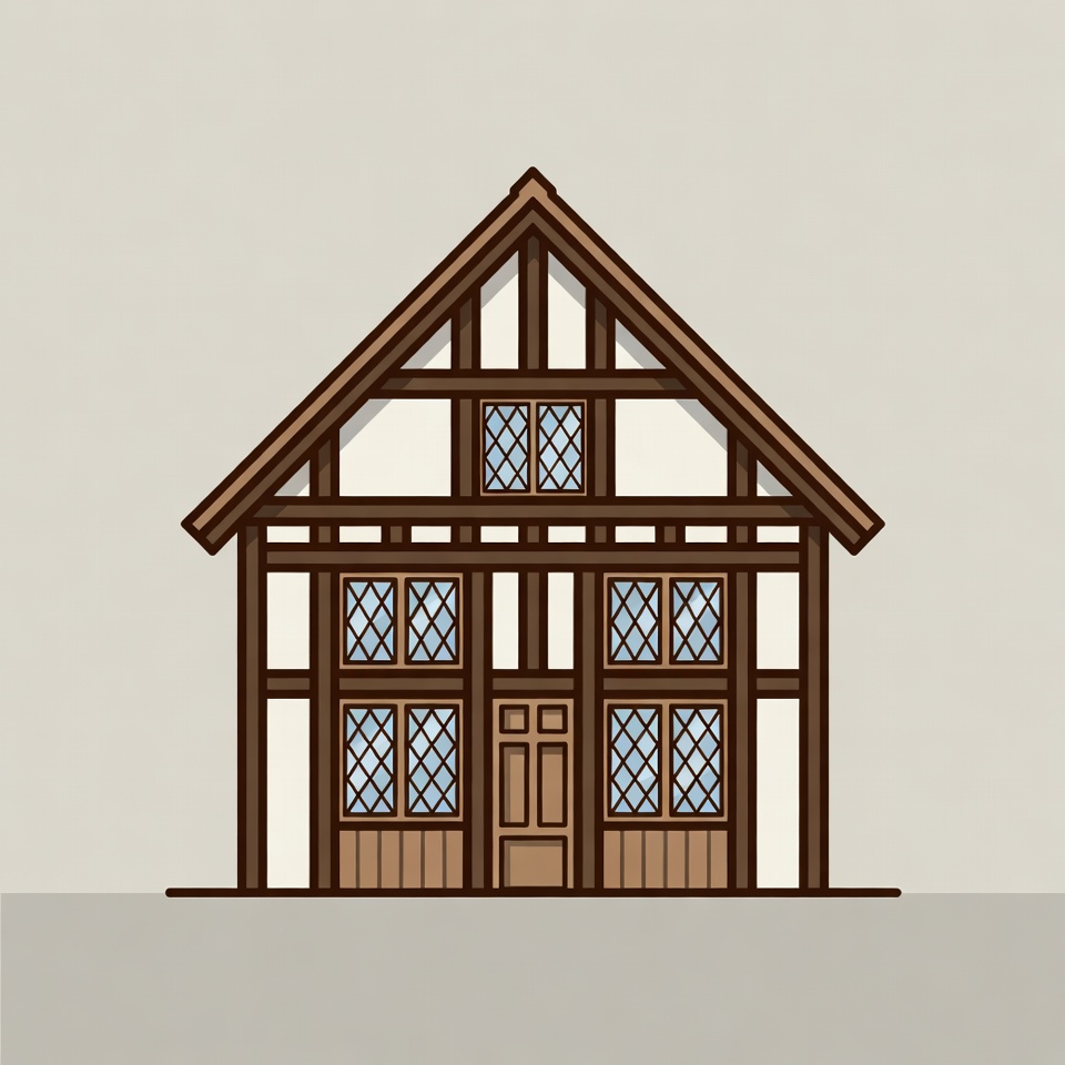 A simple line art illustration of a traditional Tudor-style house with brown timber framing and white walls. It features a steep gabled roof, multiple leaded glass windows, and a central wooden door. The house stands on a plain gray background.