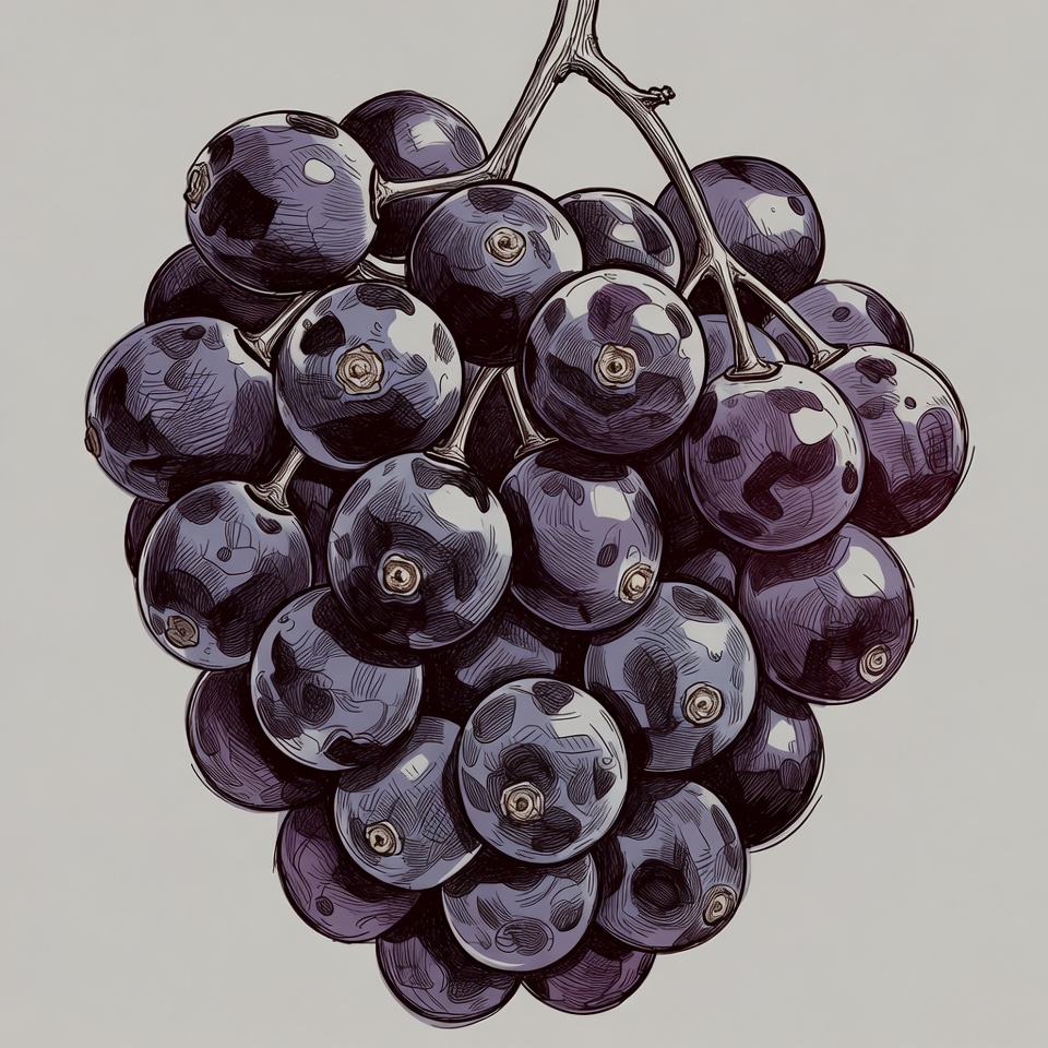 A detailed illustration of a cluster of dark purple grapes hanging from a thin stem. The grapes are shiny with highlights and subtle shading, rendered in ink-style lines on a light gray background. The bunch is densely packed and isolated for emphasis.