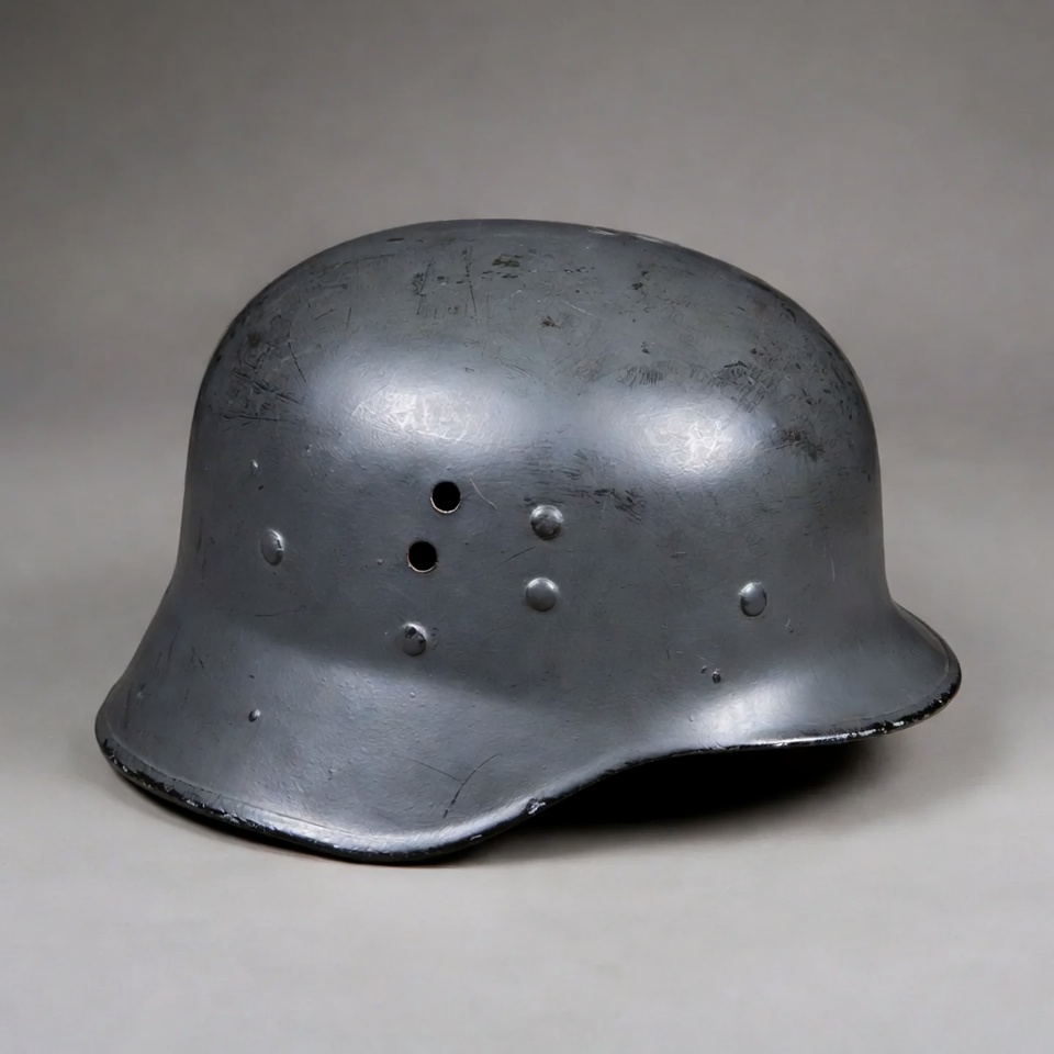 German helmet, M35 helmet, WWII helmet, gray helmet, historical helmet, isolated background, metal helmet, military helmet, side view, soldier helmet, steel helmet, ventilation holes, war helmet, worn helmet, Stahlhelm