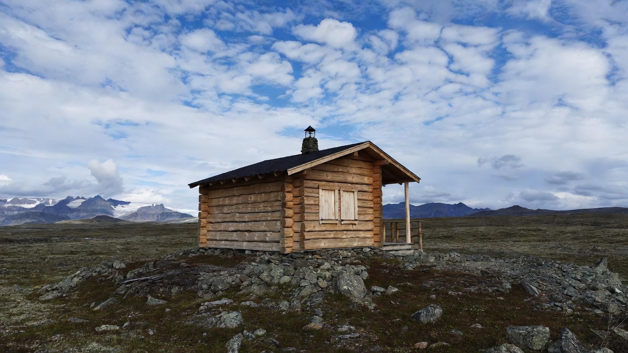 A small wooden log cabin with a sloped black roof sits on a rocky hill surrounded by tundra. Snow-capped jagged mountains rise in the background under a sky filled with scattered clouds. The cabin features boarded windows, a chimney, and a small porch.