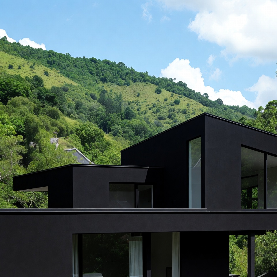 architecture, black house, blue sky, contemporary home, glass windows, green hills, hillside house, landscape, luxury residence, mountains, nature background, residential building, trees, white clouds, modern house