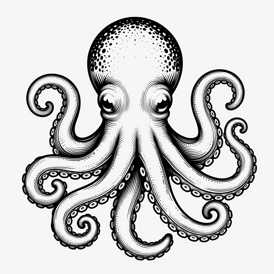 black white, cartoon octopus, cephalopod, detailed octopus, graphic design, illustration, ink drawing, isolated background, line art, marine animal, ocean animal, sea creature, tentacles, vector art, octopus
