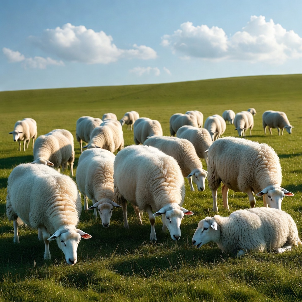 animals, blue sky, clouds, farm animals, flock, grass, grazing, green field, herd, hillside, livestock, meadow, outdoors, pasture, rural, sunny day, white sheep, sheep