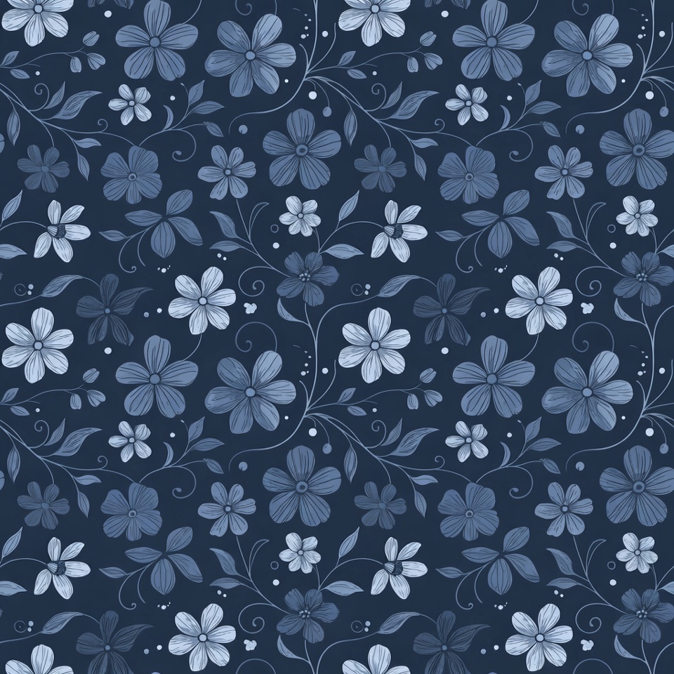 A seamless illustration features clusters of small white flowers with delicate petals and green leaves on a deep navy blue background. The floral elements are arranged in a repeating pattern with curving vines and stems. The design has a soft, watercolor-like texture.
