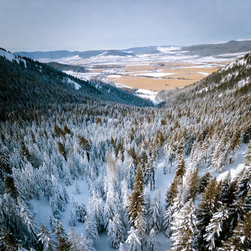 Aerial view of a deep valley filled with dense evergreen trees covered in snow. Golden fields stretch across the valley floor, flanked by distant snow-capped mountains under a clear blue sky. The forested slopes display varying shades of green and white.