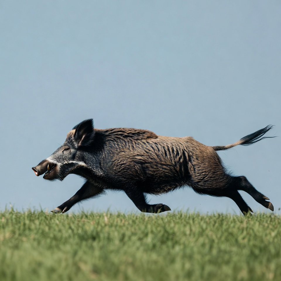 animal, blue sky, boar, brown fur, galloping, grass field, isolated background, mammal, nature, open mouth, outdoors, running, running boar, striped fur, tusks, wildlife, wild boar