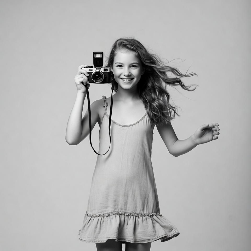 White, black and white, camera strap, child photography, female, gray background, happy expression, holding camera, joyful girl, long hair, portrait, ruffled dress, sleeveless dress, smiling girl, vintage camera, wavy hair, windblown hair, young girl, girl
