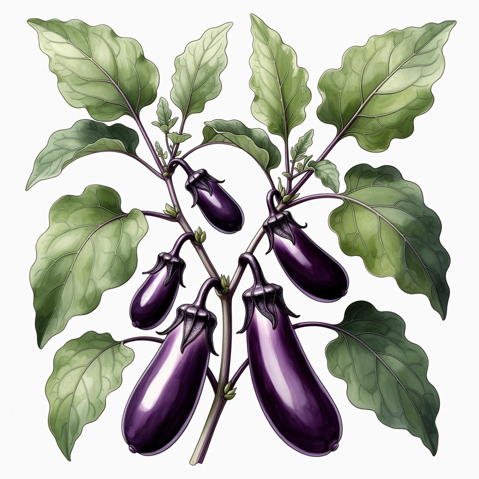 An illustration of a vibrant eggplant plant features multiple glossy purple eggplants hanging from sturdy stems. Broad green leaves surround the fruits, creating a lush botanical display. The artwork is detailed with realistic shading on an isolated white background.