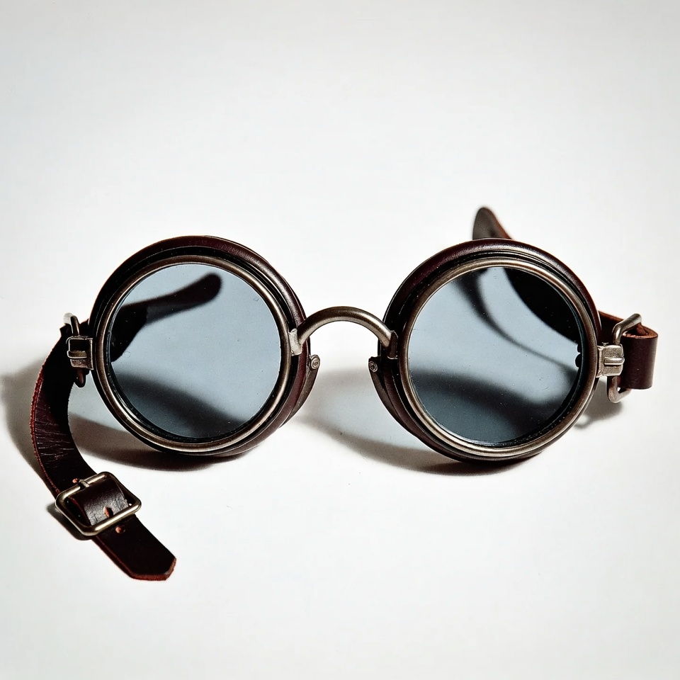 aviator goggles, blue lenses, brown leather, eyewear, isolated background, leather goggles, metal frames, pilot goggles, retro eyewear, round goggles, steampunk goggles, sunglasses, vintage eyewear, vintage goggles, goggles