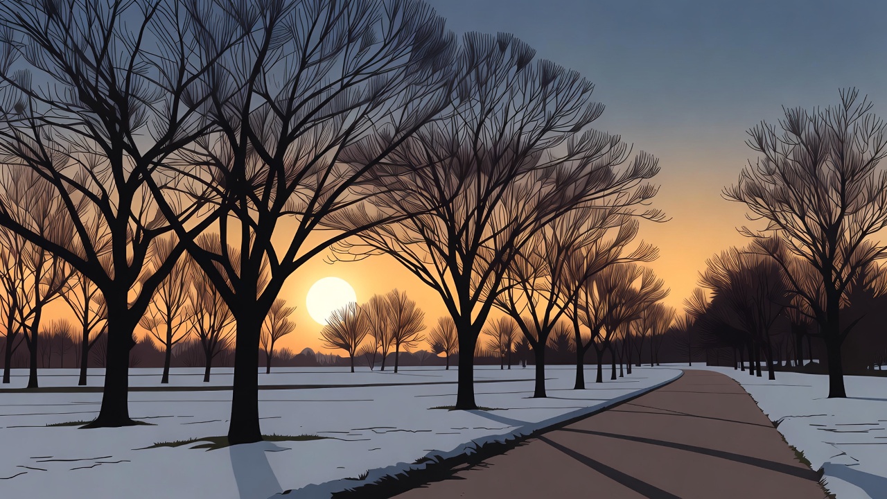 A vibrant digital illustration depicts a large orange sun setting behind rows of bare trees lining a snowy path. The ground is covered in fresh white snow, with long shadows cast by the trees across the pathway. The sky transitions from deep blue to warm sunset hues.