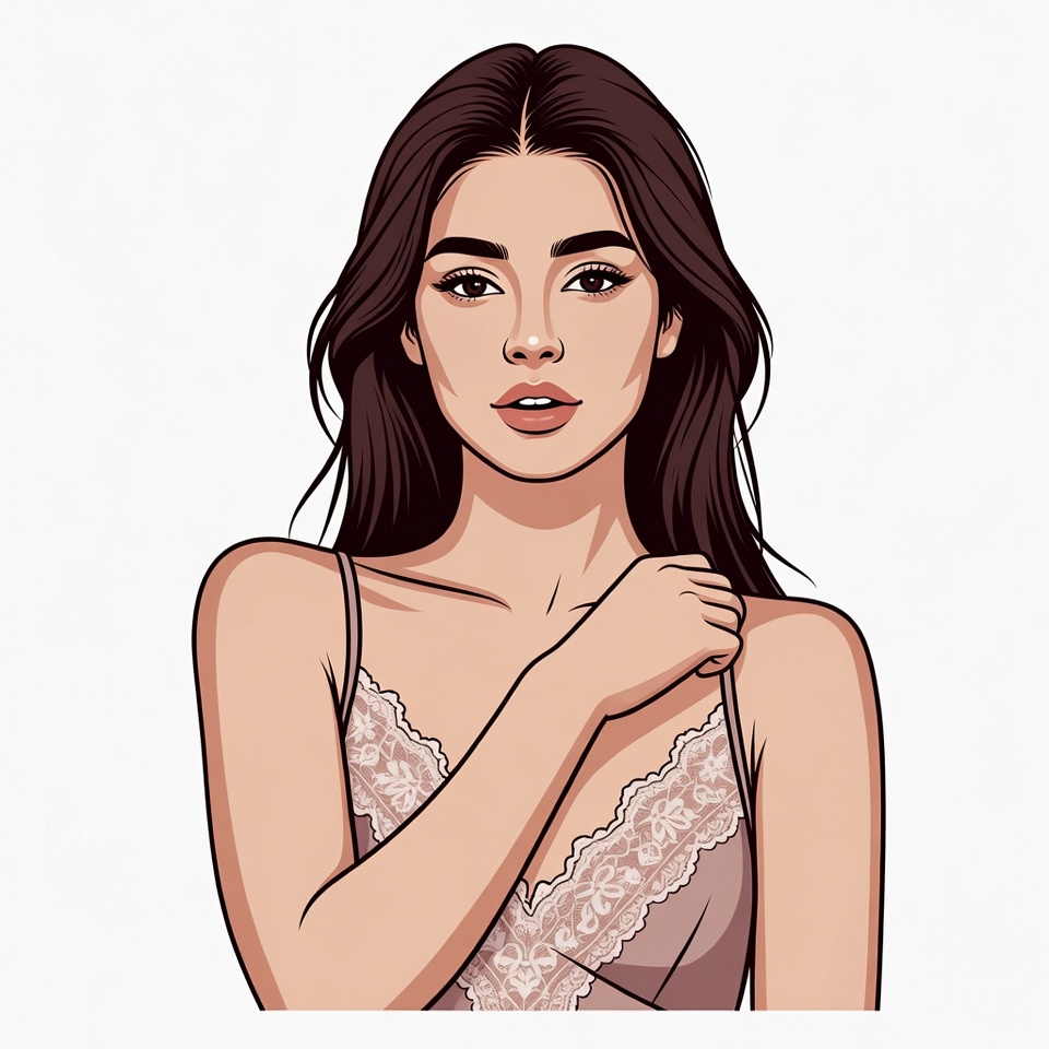 A young woman with long wavy dark brown hair poses confidently on an isolated white background. She wears a delicate pink lace camisole with thin straps and touches her shoulder gently. Her expression is alluring with full lips and expressive eyes in a vibrant vector illustration style.