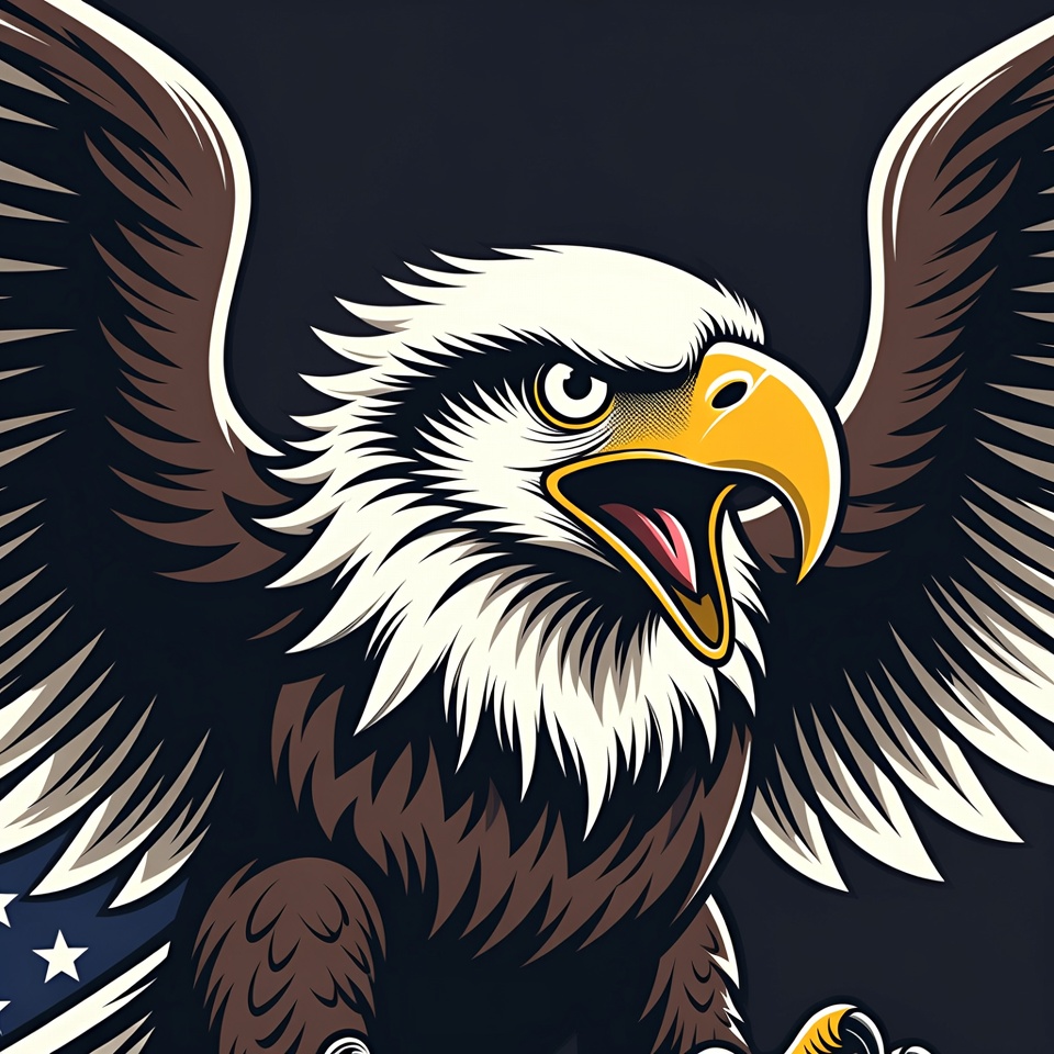 A detailed illustration of a bald eagle with wide-spread wings against a dark background. The eagle features a white head, yellow beak, and intense yellow eyes, with an American flag integrated into its body. Its feathers are rendered in bold black, white, brown, and gold tones.