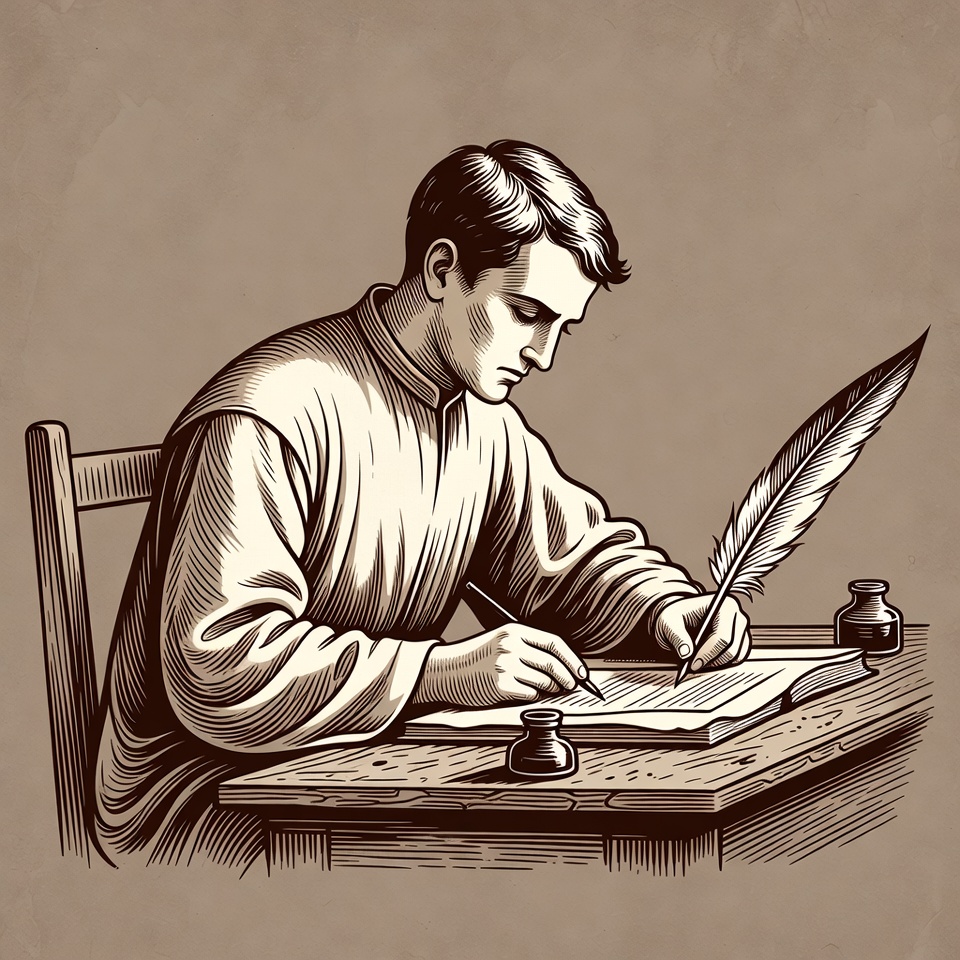 A young man in Renaissance-style clothing sits at a wooden desk, writing in an open book with a feather quill pen. An inkwell stands nearby on the table. The scene is rendered in detailed line art illustration style on a beige background.