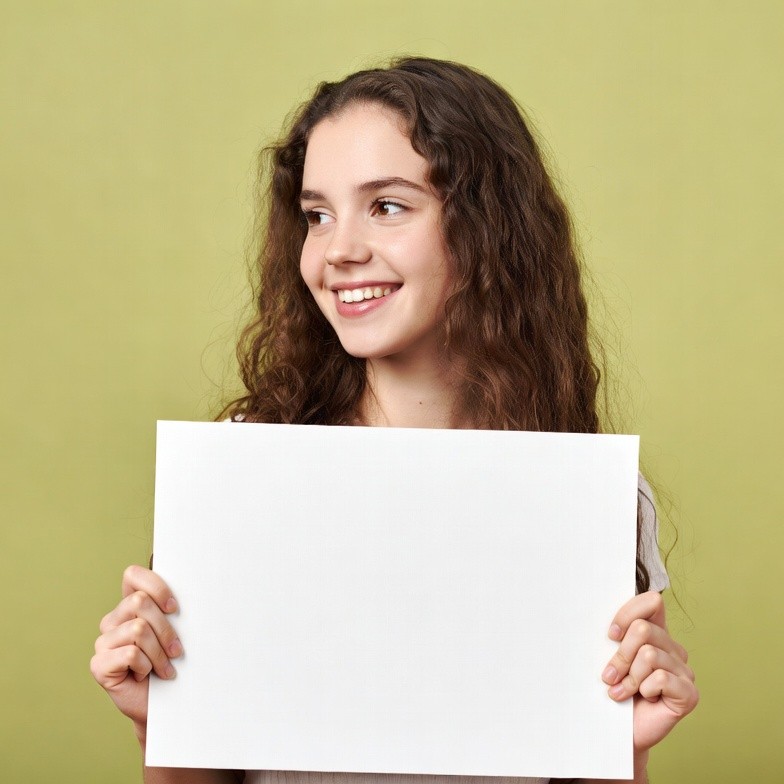 A young girl with curly brown hair smiles while holding a large white blank sign in front of her. She stands against a bright green background, wearing a light-colored top. Her expression is cheerful with eyes looking slightly to the side.