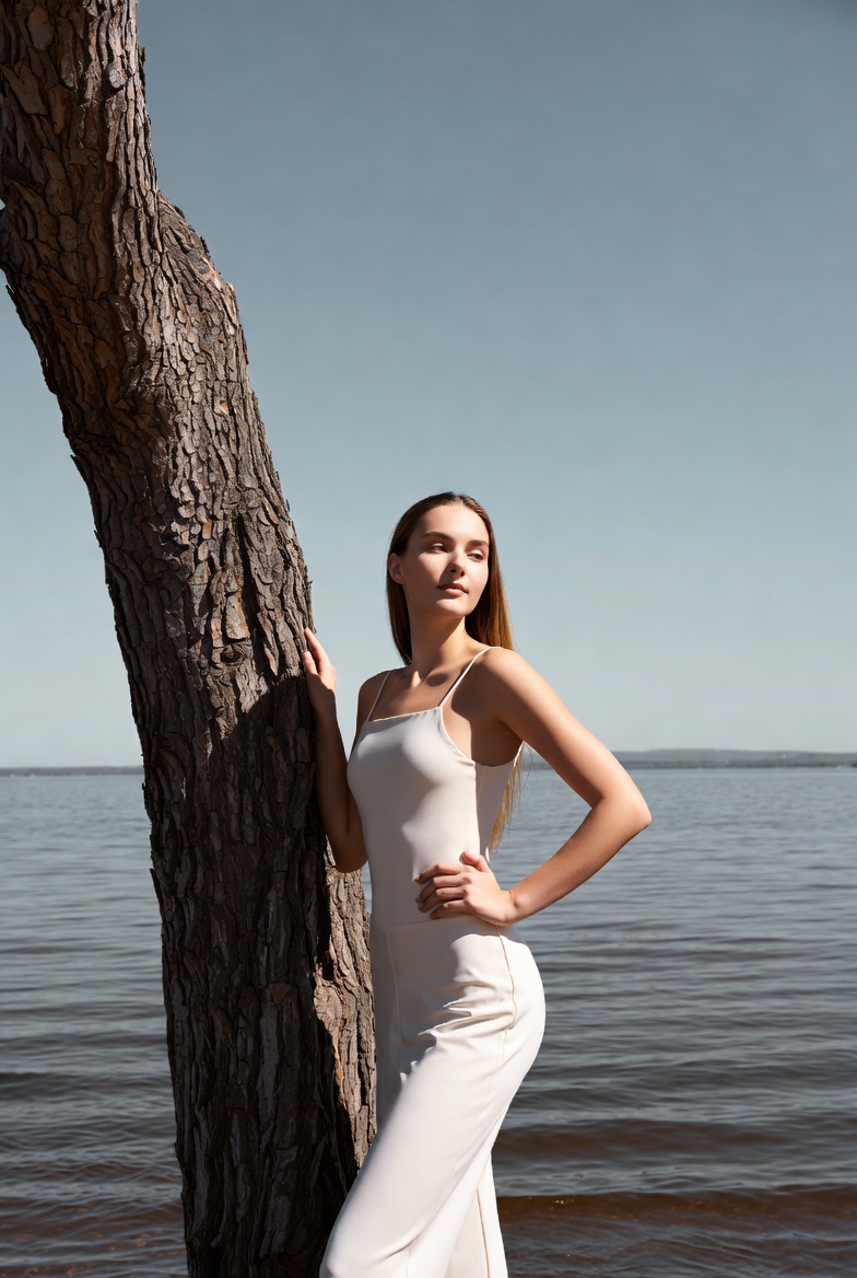 White, beach tree, calm water, clear sky, elegant, fashion, hand on hip, lake, leaning tree, long hair, natural light, nature, outdoors, pine tree, portrait, side view, slim, spaghetti straps, standing pose, summer, water, white jumpsuit, young woman, woman