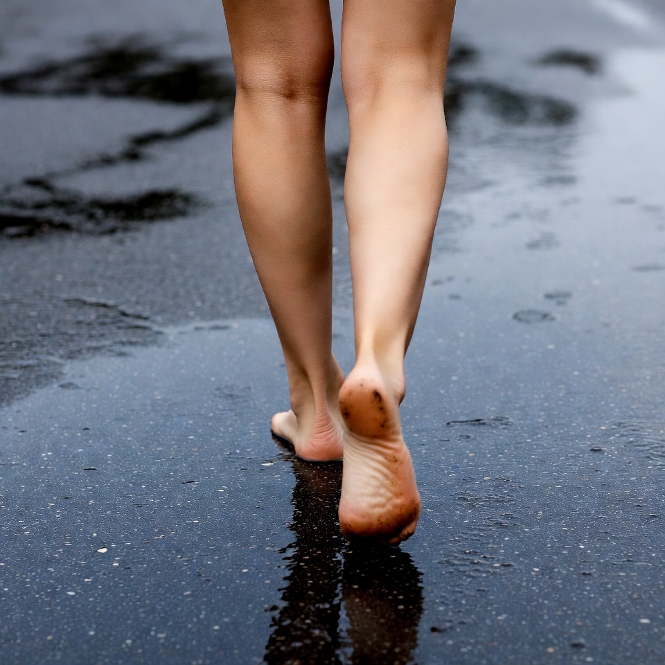 arches, asphalt, barefoot, closeup, dirty soles, feet, female, grime, heels, legs, lower legs, outdoor, puddles, reflections, road, soles, toes, walking, water, wet pavement, woman, bare feet