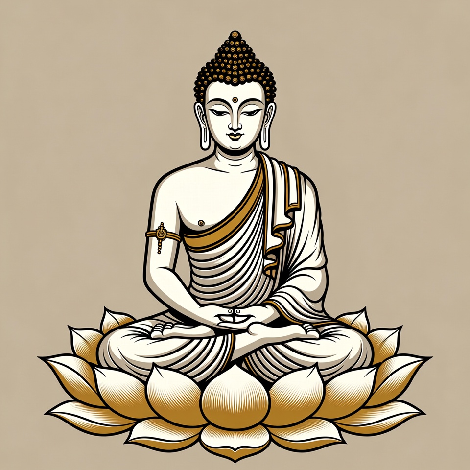 Asian, Buddhist illustration, enlightenment, gold lotus, illustration, isolated background, line art, lotus flower, meditation, meditative pose, peaceful figure, religious icon, serene face, sitting Buddha, spiritual art, traditional Buddha, vector art, white robes, zen, Buddha