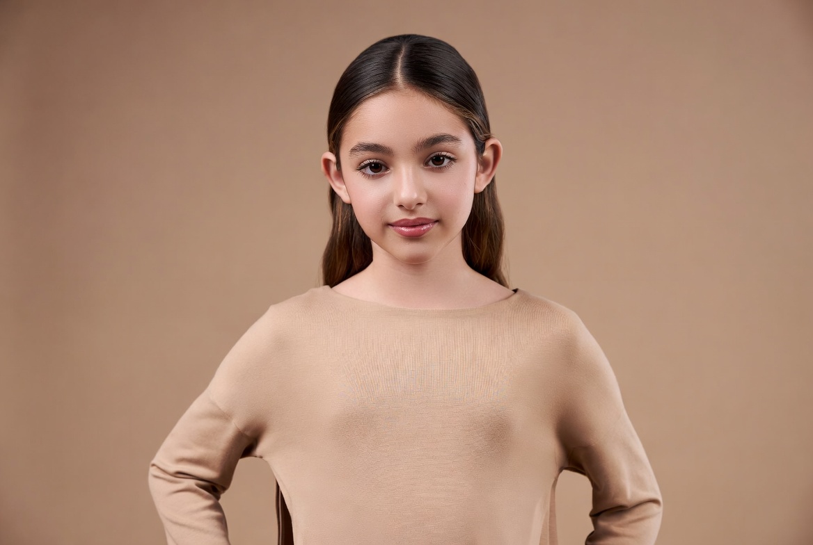 A young girl with long dark brown hair and expressive eyes stands confidently with hands on hips. She wears a long-sleeved beige sweater and poses against a matching solid brown background. Her face shows a slight smile in this close-up portrait.