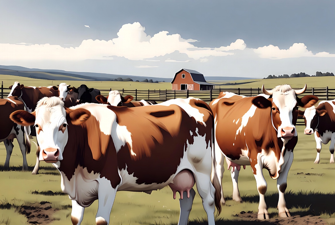 A group of Holstein cows with black and white markings stands in a green pasture near a red barn. They are gathered by a wooden fence under a partly cloudy sky with rolling hills in the background. The scene features a realistic digital illustration style.