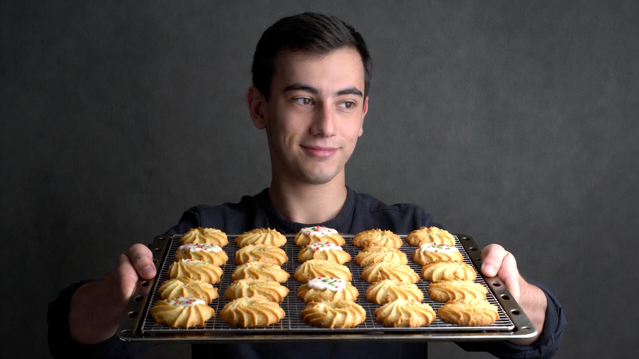 A young man with short dark hair and smiling expression holds a large metal tray filled with freshly baked golden cookies topped with white icing. He wears a dark shirt and stands against a plain gray background. The cookies are neatly arranged in rows on the tray.