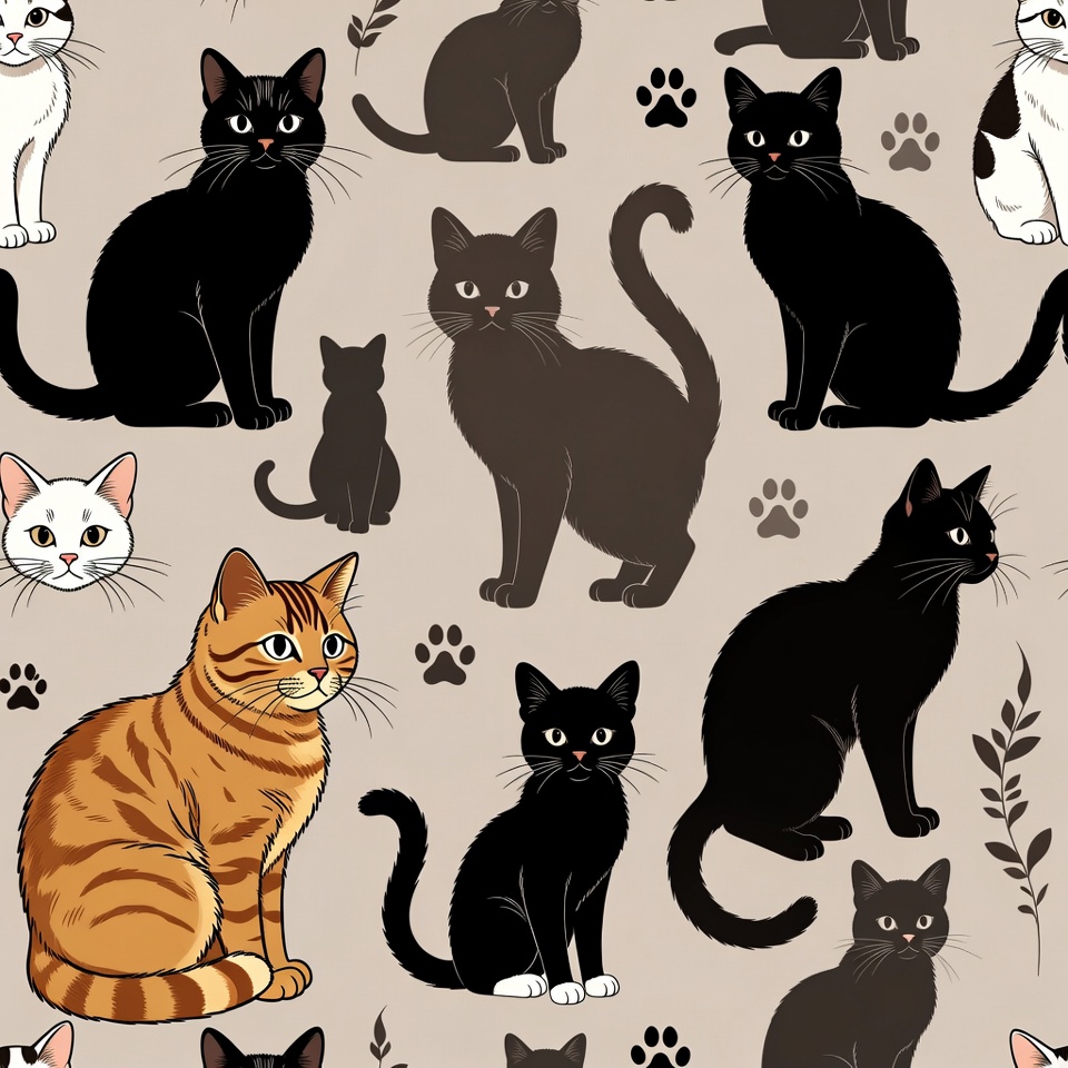 A seamless pattern illustration features various black cats in different poses on a light gray background. White cats and an orange tabby cat are also included among the black felines. Scattered cat paw prints and leaf accents add to the whimsical design.
