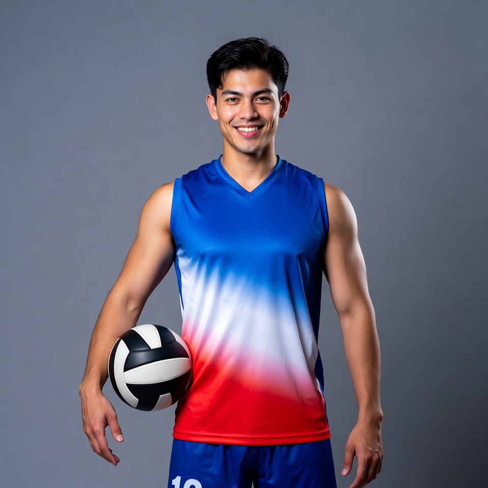 Asian, athlete, black hair, blue jersey, confident pose, gray background, holding ball, indoor, male, muscular, number 16, player, short hair, shorts, smiling, sports, sports jersey, tank top, volleyball, young man, man