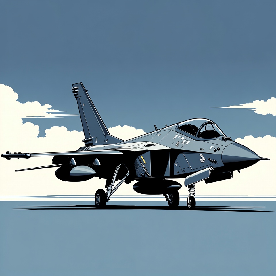 A sleek fighter jet with swept-back wings and landing gear down stands on a runway. It features a pointed nose, canopy cockpit, and underwing fuel tanks against a cloudy sky. The illustration uses bold blue tones and clean lines on an isolated background.