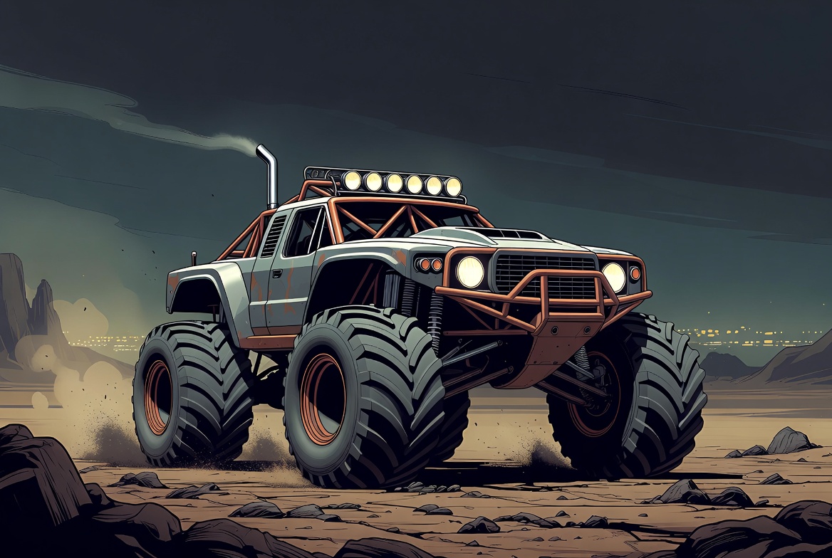 automotive, big tires, city lights, dark sky, desert, digital art, dust, extreme vehicle, futuristic truck, headlights, illustration, night, off-road, orange rims, racing, rocks, roll cage, rugged terrain, silver truck, smokestack, vehicle, monster truck