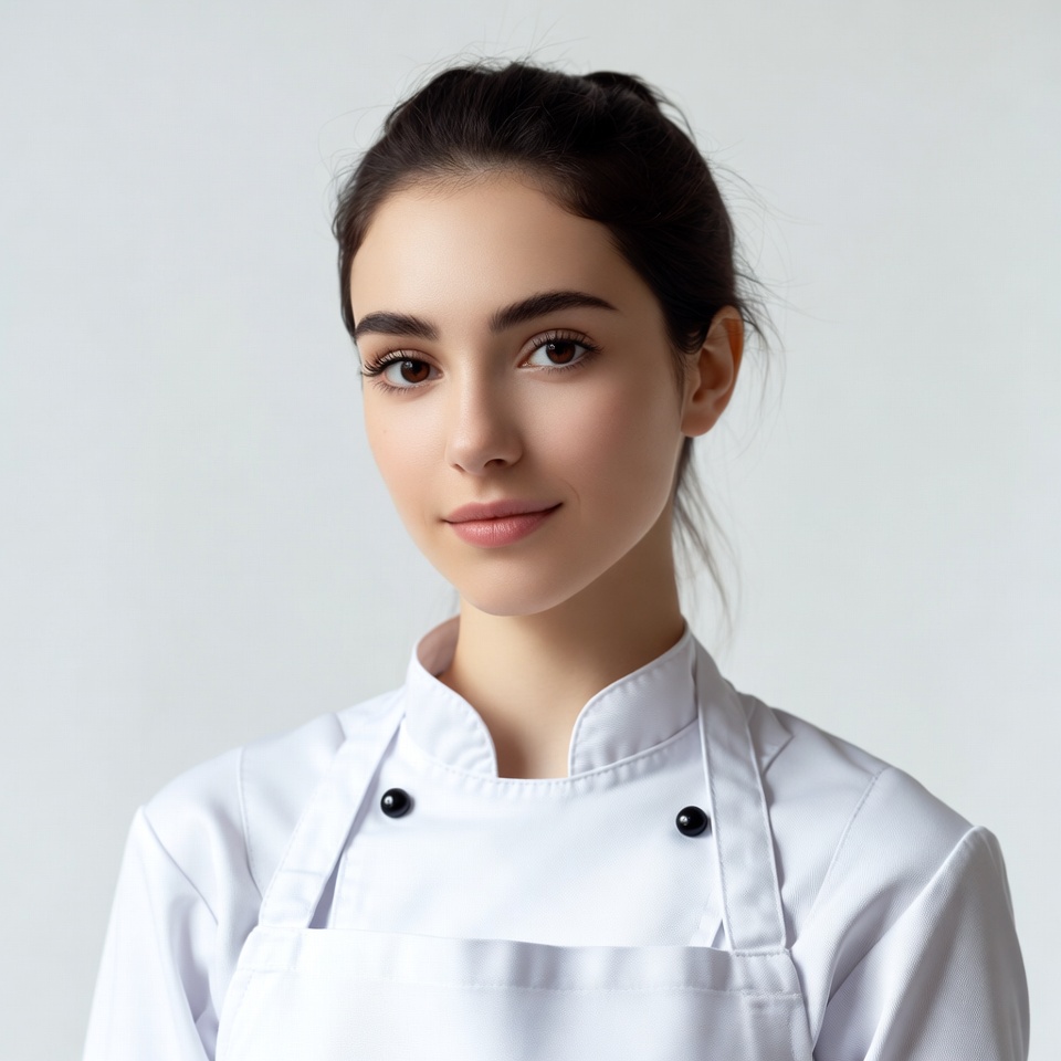 A young woman with dark hair tied in a bun stands smiling against a white background. She wears a white chef's jacket with black buttons and a matching apron. Her expression is friendly and professional.