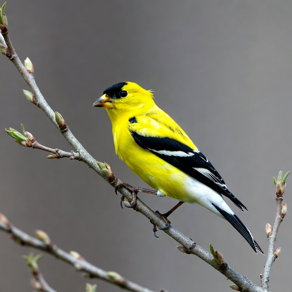 A vibrant yellow American Goldfinch with black wings and cap perches on a thin branch with budding leaves. Its white wing bars and tail feathers stand out against the soft gray background. The bird faces slightly to the side, showing its orange beak clearly.
