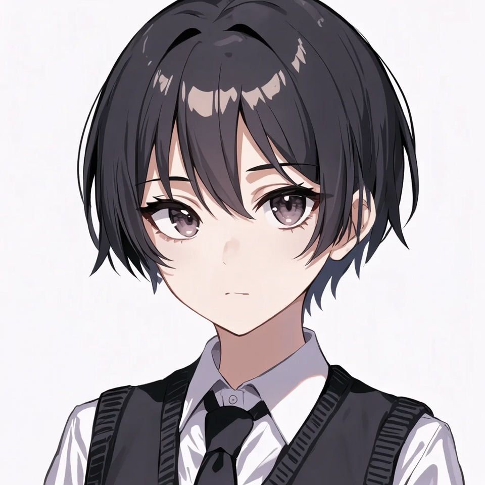 anime, black hair, black tie, black vest, boy, chibi style, illustration, isolated background, male, manga character, neutral expression, portrait, purple eyes, school uniform, short hair, white shirt, anime boy