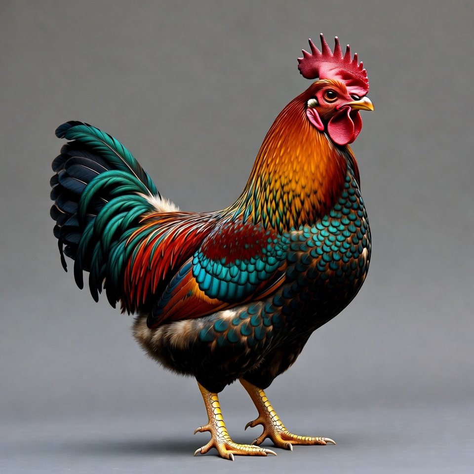 A vibrant rooster with multicolored feathers stands proudly on a plain gray background. Its red comb and wattle are prominent, with iridescent green, blue, orange, and black plumage covering its body. The rooster has yellow legs and a detailed feathered tail.